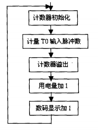 電能計(jì)量子程序流程圖如圖5所示。電能計(jì)量采用遞加的方式,單片機(jī)的P3.4T0)端輸入用電計(jì)量脈沖,計(jì)滿3200個(gè)脈沖為一度電,用電量加1,數(shù)碼顯示加1。用電量存儲(chǔ)在EEPROM中,每增1度電則電量重新存儲(chǔ)一次,管理微機(jī)定時(shí)從各個(gè)電表的EEPROM中采集用電數(shù)據(jù)。