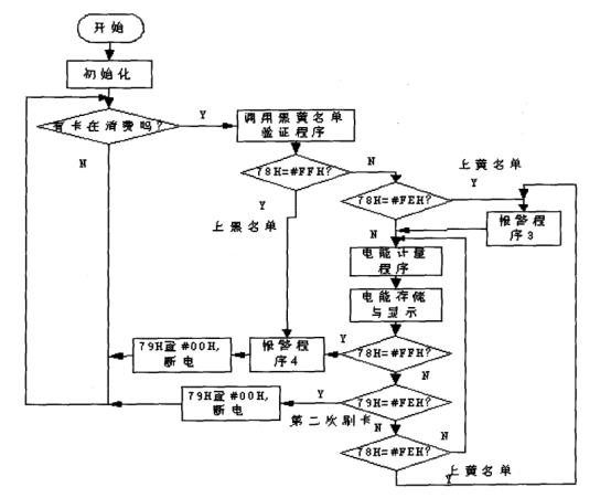 設(shè)定MCU內(nèi)部RAM78H作為黑、黃名單標(biāo)志單元,當(dāng)78H數(shù)據(jù)為#FFH時(shí),指示用戶卡已上黑名單;當(dāng)78H數(shù)據(jù)為#FEH時(shí),指示用戶卡已上黃名單;為其它數(shù)據(jù)則表明用戶卡未上黑(黃)名單。在進(jìn)行黑、黃名單驗(yàn)證時(shí),程序根據(jù)驗(yàn) 證結(jié)果對(duì)RAM78H寫入對(duì)應(yīng)的值,以供主程序判斷。RAM79H作為在有無刷卡標(biāo)志單元,如電表當(dāng)前已有用戶卡在消費(fèi),79H的內(nèi)容為#FFH;當(dāng)無用戶卡在消費(fèi)(電表處于待機(jī)狀態(tài))時(shí),79H的內(nèi)容為#00H;當(dāng)正在消費(fèi)的用戶卡第二次刷卡后,79H的內(nèi)容為#FEH,此時(shí)主程序檢測(cè)到這一狀態(tài)后,斷開用戶供電,計(jì)算本次用電后用戶的電費(fèi)余額,且將余額回寫射頻卡。