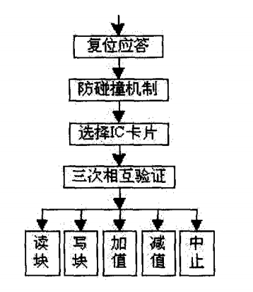 MFRC500能執(zhí)行有限的一些指令,并將這些指令傳輸?shù)?/span>MIFARE1用戶卡片上,單片機(jī)對(duì)MFRC500的某一指令操作不是簡(jiǎn)單的一條指令所能完成的,須有一個(gè)程序序列來完成,其中有對(duì)MFRC500硬件內(nèi)核寄存器的設(shè)置以及判斷。在進(jìn)行讀寫數(shù)據(jù)或增、減值操作之前還須經(jīng)過復(fù)位應(yīng)答、防碰撞、選卡及認(rèn)證過程。操作流程圖如圖6所示。本設(shè)計(jì)釆用基于Keil CC語言進(jìn)行編程,調(diào)用Philips公司提供的基本庫(kù)函數(shù)來實(shí)現(xiàn)各種功能。