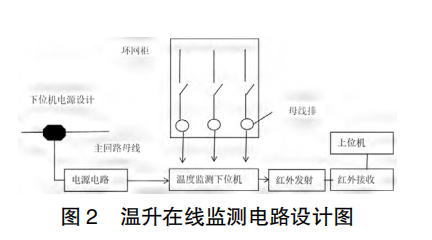 本次構建的溫升在線監測電路,配備了3面柜子,在每個柜子當中設計的結構是含三響環氧套筒,設計的監測路數分別是109路,對每相母線相互連接位置的溫升進行監測,實際溫度為1路監測柜體內溫度。結合開關柜所設置的配置,讓測溫路數增加,便于不同客戶需求有效滿足。在已經采集的溫度,采用測溫分機使用紅外通訊方式,把數據傳遞到接受分機端中,通過RS485通信,將數據傳遞到主控電腦上。這就不需要監測人員實際到現場,只需要采用主控電腦就能監測整個環網柜系統溫升情況,更加及時發現可能會存在的問題,預判事故,促進供電可靠性提升。圖2為溫升在線監測電路設計圖。