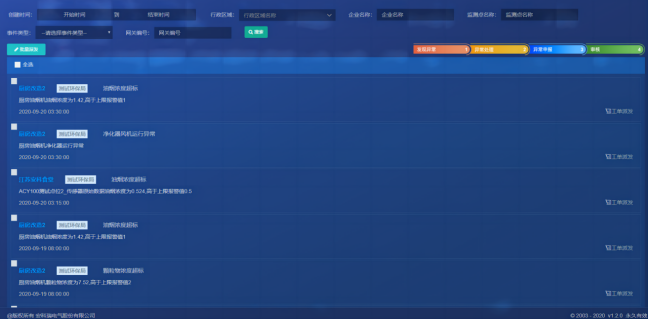 后臺根據測點設置的濃度閾值以及門限時間在隱患巡查中產生對應的報警信息,并在首頁進行鈴鐺和語音提示。企業用戶對隱患進行確認,確認工單派發對象,工單截至期限,以及工單任務描述;運維人員確認工單內容并對隱患進行處理,填寫處理結果詳情,上傳現場圖片等附件或進行二級派發;相關企業用戶可在“隱患記錄”頁面來確認對應隱患信息的處理進度,包括是否處理、是否派發。