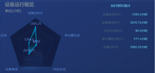 企業在線時長報告模塊,將企業目前監測儀的在線時長,失聯時長,風機、凈化器的在線、離線時間進行匯總,以折線圖、雷達圖的形式展示。