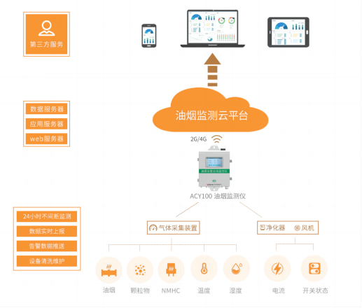 實現采集監控油煙凈化器設備開關狀態信號、清潔度信號,及通過油煙濃度監測模塊采集排放的油煙中油煙濃度信息,并預留揮發性有機物的在線檢測接口。