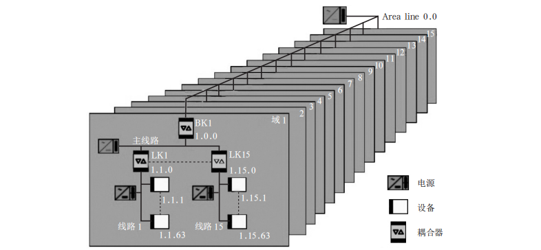 KNX系統采用分層結構,分域(Area)和線路(Line),線路是KNX系統的更小結構單元。每個線路至多包括4個線段(Line Segment),每個線段至多可連接64臺設備,每個設備都有一個物理地址。一般情況下,可以有15個線如果有多個域存在時,每個域需要通過主干耦合器(BK)與干線路相連接。一個系統最多包括15個域,這樣理論上一個KNX系統可以連接58000多臺總線設備。KNX拓撲結構如圖 1 所示。