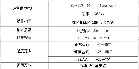 用于接受外部干接點信號輸入,可通過不同參數配置實現開關、調光、場景、窗簾控制、調溫、報警等功能,電氣參數如下: