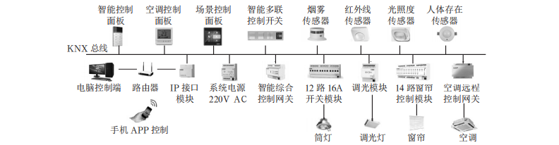 (1)系統元件。負責整個KNX總線網絡系統的運行, 如KNX總線電源、KNX/IP網關、線路耦合器等。