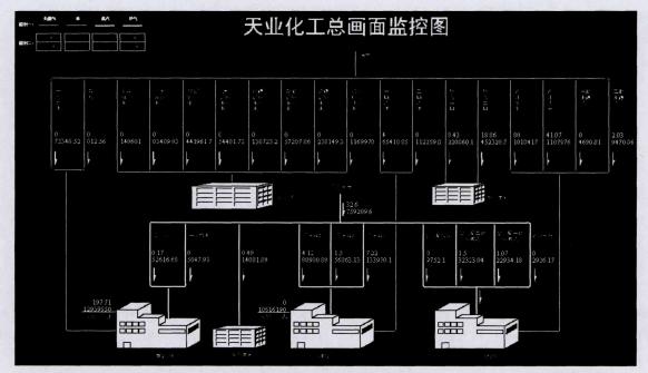 在下位機(jī)硬件和上位機(jī)軟件系統(tǒng)平臺(tái)搭建完成后,可以利用工業(yè)組態(tài)軟件平臺(tái)設(shè)計(jì)監(jiān) 測(cè)與監(jiān)控系統(tǒng),該系統(tǒng)提供能源消耗及使用數(shù)據(jù)的實(shí)時(shí)顯示與分析、歷史記錄與趨勢(shì)查詢、各種報(bào)表與統(tǒng)計(jì)等,如系統(tǒng)功能實(shí)時(shí)顯示現(xiàn)場(chǎng)生產(chǎn)數(shù)據(jù)與趨勢(shì),各畫(huà)面之間可方便地切換 (如圖4為新疆天業(yè)化工有限責(zé)任公司總畫(huà)面監(jiān)控圖),可根據(jù)生產(chǎn)需要對(duì)現(xiàn)場(chǎng)數(shù)據(jù)進(jìn)行采集 統(tǒng)計(jì)與運(yùn)算處理,并通過(guò)各種形式實(shí)時(shí)顯示。