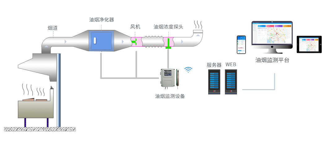 對油煙排污數據的監測,包括油煙排放濃度,顆粒物,NmHc等數值采集監測;同時對監控風機和凈化器的啟停狀態、運行數據進行監測。