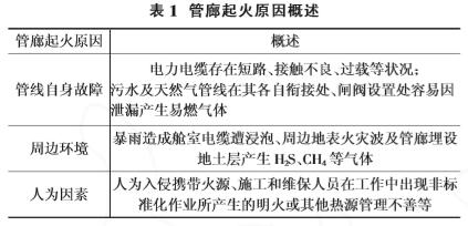 可燃物、助燃物和起火源稱為燃燒的三要素,當管廊內滿足上述三要素時,便會產生起火現象,導致火災發生。