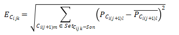 能耗指數:能耗指數可以反應出能耗網絡中一個節點的能耗量在該節點所在等級中所占的比例,若節點Cij+1l表示節點Cijk關系子集SetCijk-Son中的一個節點,則能耗指數P的計算式為: