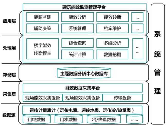 如圖1所示,綜合能耗監(jiān)測(cè)系統(tǒng)框架包括功能應(yīng)用層、邏輯處理層、數(shù)據(jù)存儲(chǔ)層、數(shù)據(jù)采集層、數(shù)據(jù)源五層架構(gòu)。其中,功能應(yīng)用層包括能源監(jiān)測(cè)、能效分析、能效診斷、輔助決策以及檔案維護(hù)、系統(tǒng)管理等用戶功能,通過多維度、可視化的系統(tǒng)功能界面實(shí)現(xiàn)與用戶的信息互動(dòng);邏輯處理層通過建立能耗評(píng)估模型,并利用數(shù)據(jù)挖掘、統(tǒng)計(jì)計(jì)算、多維分析等手段對(duì)能耗數(shù)據(jù)進(jìn)行分析,為功能應(yīng)用層提供直接的數(shù)據(jù)支持;數(shù)據(jù)存儲(chǔ)層利用主流結(jié)構(gòu)化數(shù)據(jù)庫對(duì)能耗數(shù)據(jù)進(jìn)行分類存儲(chǔ),提高邏輯處理層的處理性能;數(shù)據(jù)采集層利用終端采集設(shè)備實(shí)現(xiàn)對(duì)智能電表、智能水表和智能冷熱計(jì)量表等遠(yuǎn)傳終端的數(shù)據(jù)源采集,為整個(gè)綜合能耗監(jiān)測(cè)系統(tǒng)提供基礎(chǔ)數(shù)據(jù)支撐。
