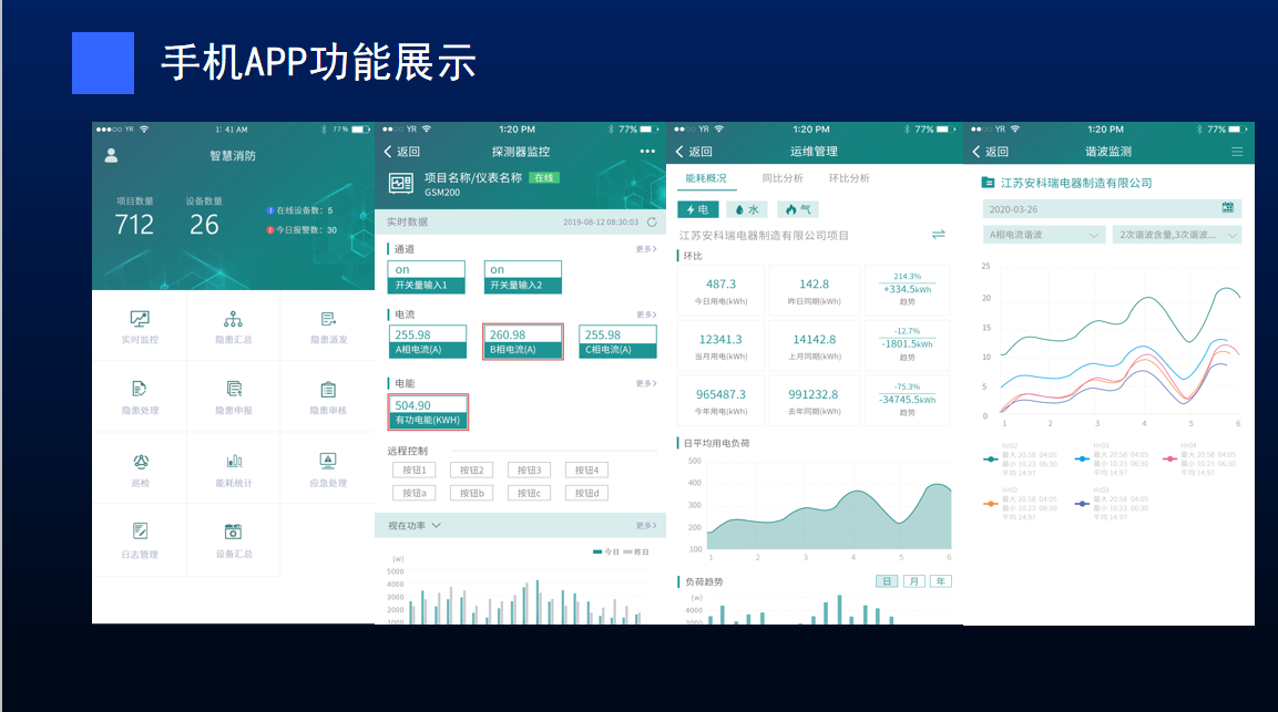 手機APP軟件具有IOS版本和安卓版本,并與電腦終端系統(tǒng)的數(shù)據(jù)同步,能展示剩余電流、溫度、電壓、電流等電氣安全參數(shù)的實時監(jiān)測數(shù)據(jù)及變化曲線、歷史數(shù)據(jù)與變化曲線;短路、斷線、漏電、超溫、過壓、欠壓、過流等電氣故障實時報警數(shù)據(jù)等;能實時顯示項目地理位置、未排除隱患數(shù)、未處理巡檢數(shù)等;通過APP消息推送的方式提醒用戶實時報警信息;可以實現(xiàn)遠程復(fù)位、遠程分閘功能;可以對所有現(xiàn)場探測器進行遠程參數(shù)設(shè)定及修改;可以對所有現(xiàn)場探測器的遠程控制記錄進行查詢;