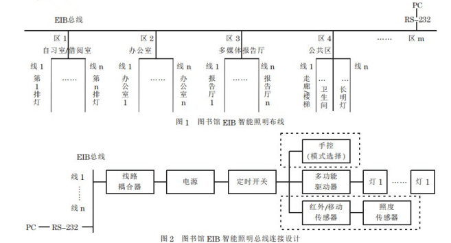 以某校圖書館照明系統為例,應用 EIB 總線技術來實現分散管理,集中控制的智能照明系統設計。 圖書館內部功能區可分為學生自習室、圖書借閱庫,辦公室、多功能報告廳以及公共區(走廊、樓梯、衛生間)5 部分。