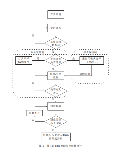 在 ETS3 的編程下,圖書館 EIB 智能照明控制可實現定時、紅外/移動、調光、手動控制(模式選擇)等功能。其總體工作流程如圖 4 所示。其中在多功能報告廳中如以手控方式選擇了某種照明模式,如模式A:舞臺燈光減弱,則后續控制將繼續對會場照明有效;如模式 C:會場燈光減弱,后續控制將只對舞臺照明有效;如同時對舞臺和會場照明都進行了手動控制,后續控制將無效。
