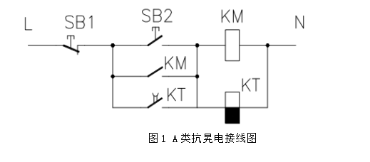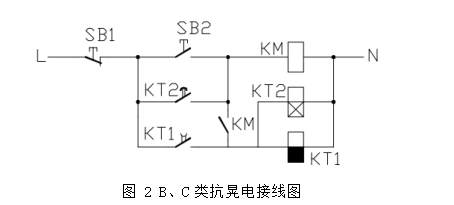 這種抗晃電方式,是目前某化工廠普遍使用的一種方式,使用兩個時間繼電器,其接線方式如圖2所示,當電網發生波動時,接觸器的線圈失電,接觸器的輔助常開接點KM斷開,時間繼電器KT1的輔助常開接點延時斷開。電網恢復時,通過時間繼電器KT1斷電延時斷開的輔助接點(KT1)接通時間繼電器KT1和KT2的線圈,KT2輔助接點得電延時閉合接通接觸器KM線圈,實現電動機的自啟動。B類、C類時間分別整定為KT1=4s,KT2=6s;KT1= 4s,KT2=8s。