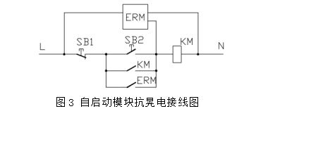 這種抗晃電方式,是某化工廠部分配電室原有的帶自啟動模塊(ERM)的一種接線方式,與一種單時間繼電器方式差不多,如圖3所示,當電網發生波動時4s鐘之內恢復供電(4s鐘固定不可調),自啟動模塊的節點延時閉合,啟動電動機,4s以后來電就不再啟動電動機。自啟動模塊(ERM)自開工至今已經使用十幾年了,由于原來的自啟動模塊(ERM)原件已老化,不能準確動作,新模塊又采購不到,所以,這種模式已基本被淘汰。
