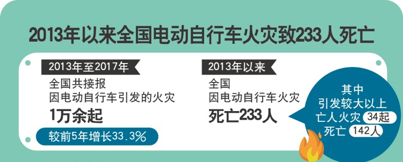 據統計,我國電動自行車保有量超過2億輛,全國年產量超過3000萬輛,是世界上電動自行車產銷第一大國。2013~2017年全國共接報因電動自行車引發火災10000余起,較大以上亡人火災34起,造成142人死亡,占較大亡人火災總數的11%(以上數據來自于應急管理部),電動自行車引起的火災事故有逐年增長的趨勢。