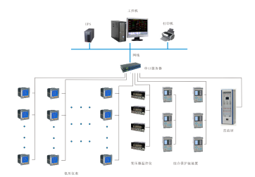監控范圍為: 10KV站包含第三方綜合保護裝置2臺模擬屏1臺;變壓器溫控儀、多功能儀表、直流屏通過485總線接入本變電所內采集器,進而通過網絡傳輸至后臺,從而在監控主機上實現總線上儀表與監控主機的數據連通。如下圖所示:站控管理層、網絡通訊層和現場設備層。