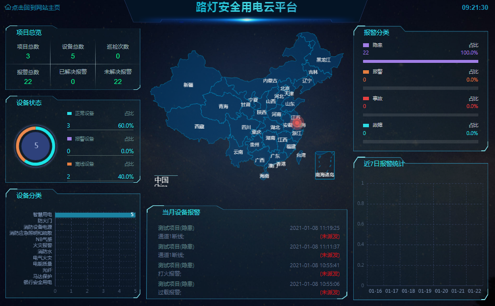 2.監測路燈的電流電壓工作狀態,可以分級設置預警值和報警值,當超出閾值范圍時進行預警和報警,