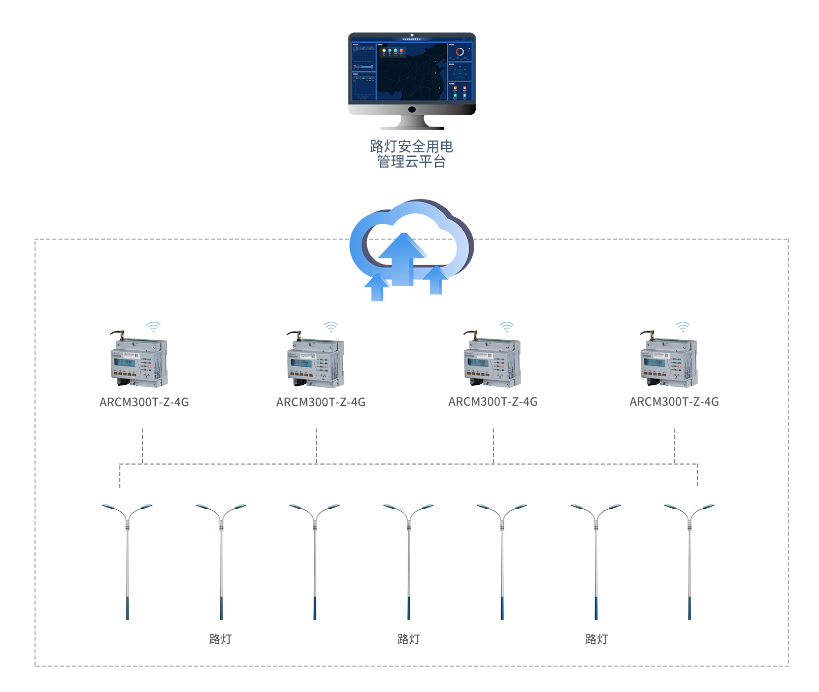 直接接入ARCM310儀表,監控每個路燈的電壓、電流等電參量進行預警和報警,也可設置定時通斷時間并遠程控制路燈通斷