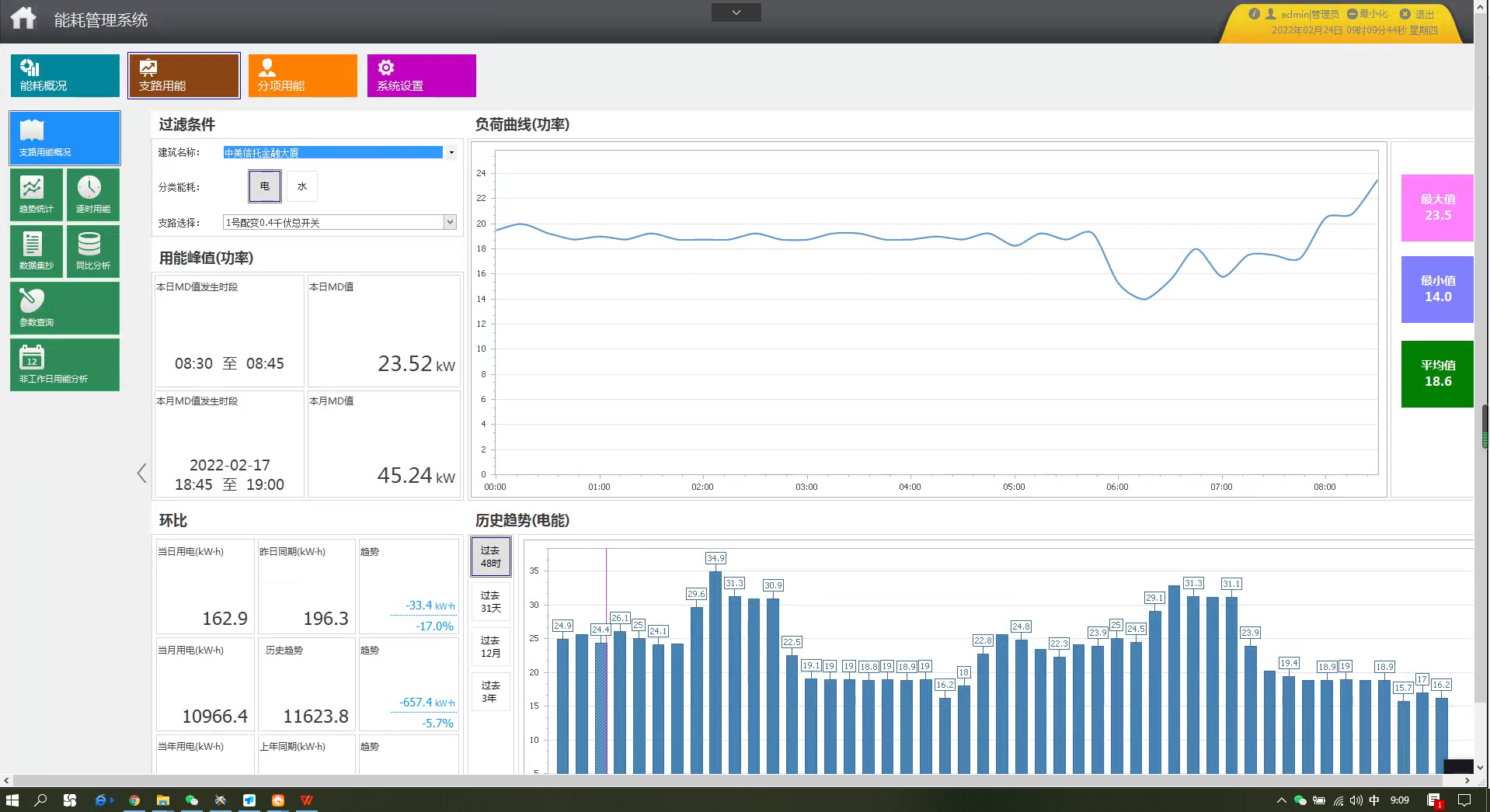 Acrel-5000能耗管理系統可以根據分類能耗的支路名稱查詢用能情況,顯示當日和當月的用能峰值(電能對應Z大需量值)、當日用能、當月用能、當年用能以及昨天同期用能、上月同期用能、上年同期用能的比較情況;以柱狀圖顯示過去48小時、31天、12個月、3年的能耗情況;以曲線圖顯示15分鐘的負荷用能走勢(電表顯示功率曲線,流量表顯示流速曲線),并顯示當前值、15分鐘內的Z大值和Z小值。