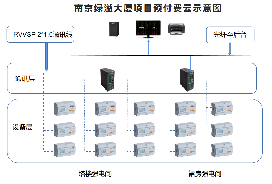 現對項目中安裝的預付費電能表區域接入預付費云平臺系統,實現遠程抄表、遠程控制電表、遠程售電等功能。現場電表主要分布在裙房、塔樓層配電間中;