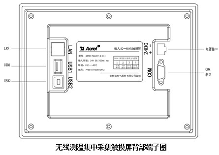 無線測溫集中采集觸摸屏:無線測溫觸摸屏可以嵌入式安裝在高壓柜、低壓抽屜柜內,每臺裝置可以接收240個傳感器的數據,可與ATE100、ATE200、ATE300三種傳感器選配使用。裝置帶有一路485接口、可選配一路以太網口,可將采集到的溫度數據上傳到監(jiān)控中心。