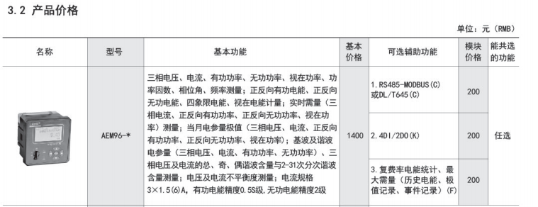 AEM 三相嵌入式多功能電能表,是主要針對電力系統,工礦企業,共用設施的電能統 計、管理需求而設計的一款智能儀表,產品具有精度高、體積小、安裝方便等優點。集成全 部電力參數測量及全面的電能計量及考核管理,提供上 24 時、上 31 日以及上 12 月的各類 電能數據統計。具有 31 次分次諧波與總諧波含量檢測,帶有開關量輸入和繼電器輸出可實 現“遙信”和“遙控”功能,并具備報警輸出。帶有 RS485 通信接口,可選用 MODBUS‐RTU 或 DL/T645‐2007 協議。本系列包括 96 型、42 型兩種規格,其中 42 型還具有零線電流測量 功能。該電力儀表可廣泛應用于各種控制系統,SCADA 系統和能源管理系統中。