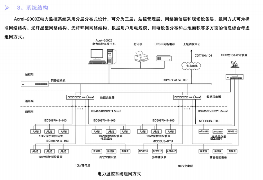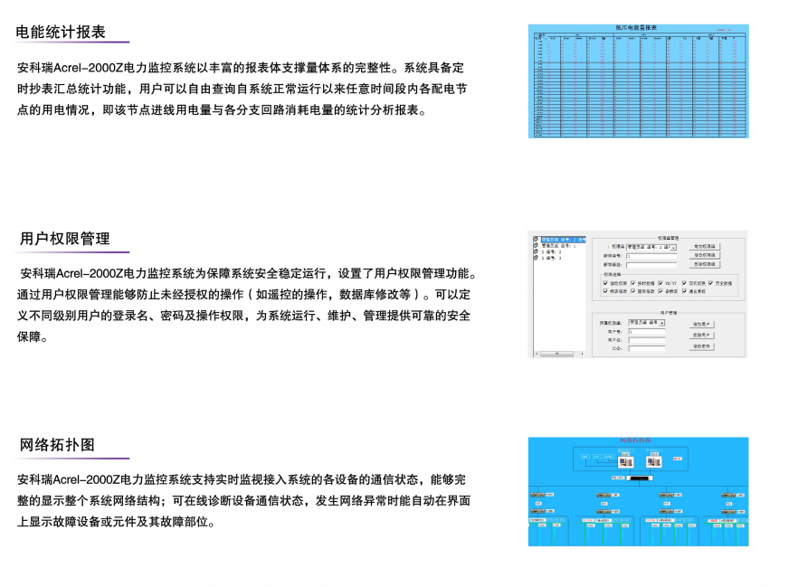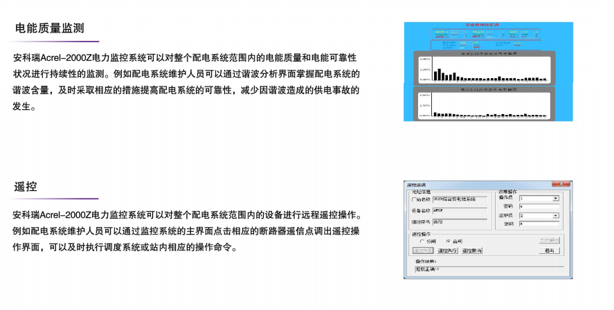 Acrel-2000Z電力監控系統是安科瑞電氣股份有限公司根據電力系統自動化及無人值守的要求,針對35KV及以下電壓等級研發出的一套分層分布式變電站監控管理系統。該系統是應用電力自動化技術、計算機技術和信息傳輸技術、集保護、監測、控制、通訊等多功能于一體的開放式、網絡化、單元化、組態化的系統,適用于35KV及以下電壓等級的城網、農網變電站和用戶變電站,可實現對變電站全方位的控制和管理,滿足變電站無人或少人值守的需求,為變電站安全、穩定、經濟運行提供了堅實的保障。